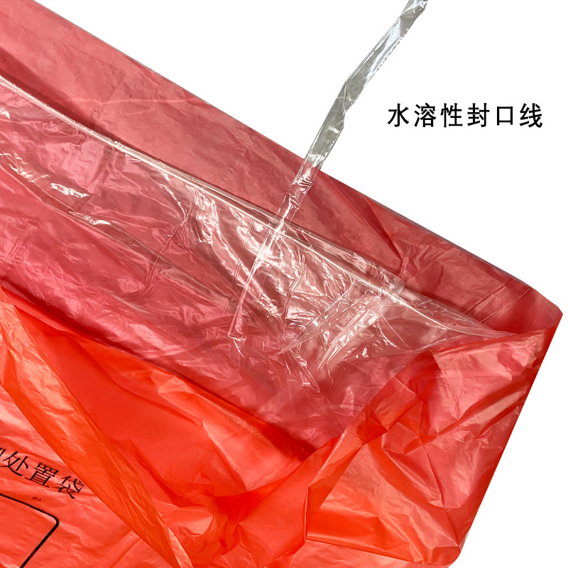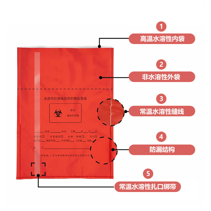 型号:BLY-A017-04 规格:71*75cm(小号) 材质:外层采用耐高温的非水溶性环保塑料薄膜和水溶性组合成特殊结构的防漏、防刺穿保护层、内层采用全水溶性材料制造的密闭袋体。 特点:不仅加强处置袋底部承重能力和减少异物刺穿的风险,同时弥补了单层水溶性处置袋不能承载高湿织物的缺陷,己包装感染性医用织物的处置袋投入洗衣机舱内,注水后扎口水溶性绑带遇到水分裂并完全溶解,外层非水溶袋两侧水溶线遇水溶解,外袋自行解体打开,内层水溶性袋遇到水分裂并完全溶解,内装织物被释放出来,进入正常消毒洗涤程序。外袋随洁净织物出舱,捡出作生活垃圾处理。