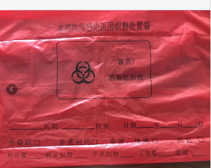 特点:不仅加强处置袋底部承重能力和减少异物刺穿的风险,同时弥补了单层水溶性处置袋不能承载高湿织物的缺陷,己包装感染性医用织物的处置袋投入洗衣机舱内,注水后扎口水溶性绑带遇到水分裂并完全溶解,外层非水溶袋两侧水溶线遇水溶解,外袋自行解体打开,内层水溶性袋遇到水分裂并完全溶解,内装织物被释放出来,进入正常消毒洗涤程序。外袋随洁净织物出舱,捡出作生活垃圾处理。