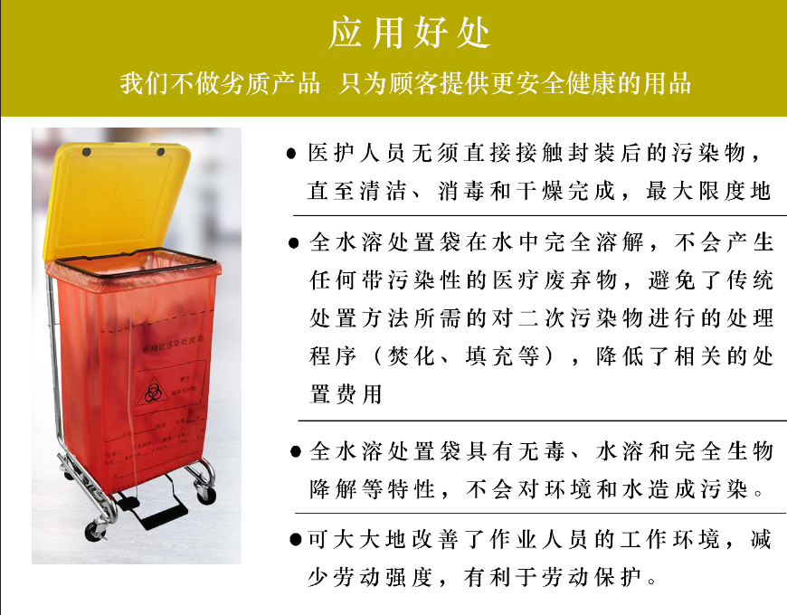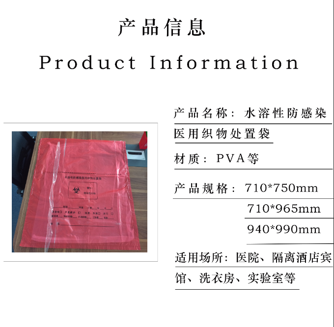 材质:外层采用耐高温的非水溶性环保塑料薄膜和水溶性组合成特殊结构的防漏、防刺穿保护层、内层采用全水溶性材料制造的密闭袋体。