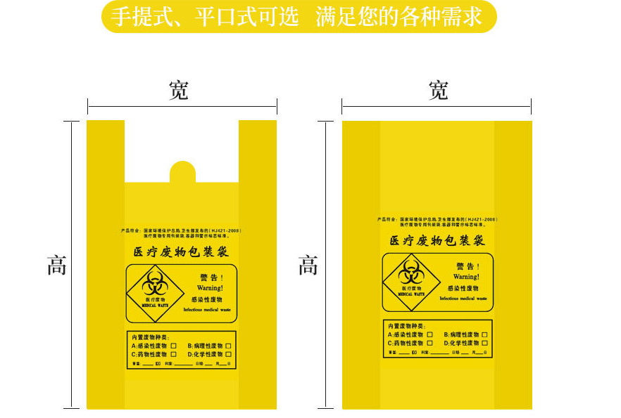 用于盛装除损伤性废物之外的医疗废物的初级包装袋,取代传统的普通塑料包装袋,国家规定必须规范使用医疗废物包装袋。