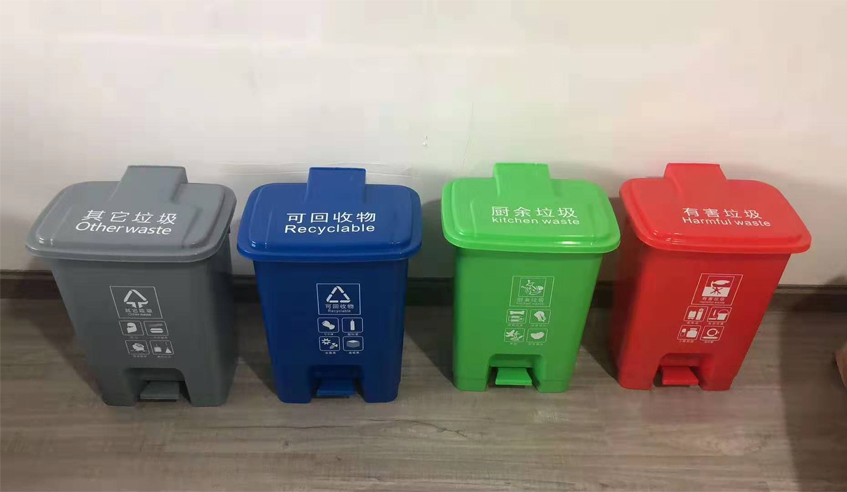 7.颜色:有害垃圾桶红色、厨余垃圾桶绿色、可回收垃圾桶蓝色、其他垃圾桶灰色,桶体侧面或桶身明显处印分类垃圾标识。
