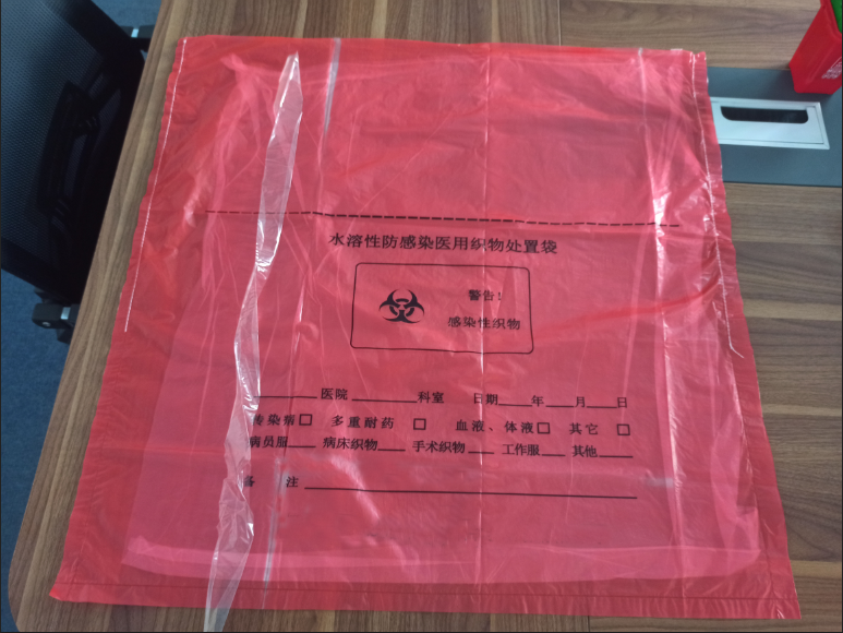 特点:不仅加强处置袋底部承重能力和减少异物刺穿的风险,同时弥补了单层水溶性处置袋不能承载高湿织物的缺陷,己包装感染性医用织物的处置袋投入洗衣机舱内,注水后扎口水溶性绑带遇到水分裂并完全溶解,外层非水溶袋两侧水溶线遇水溶解,外袋自行解体打开,内层水溶性袋遇到水分裂并完全溶解,内装织物被释放出来,进入正常消毒洗涤程序。外袋随洁净织物出舱,捡出作生活垃圾处理。